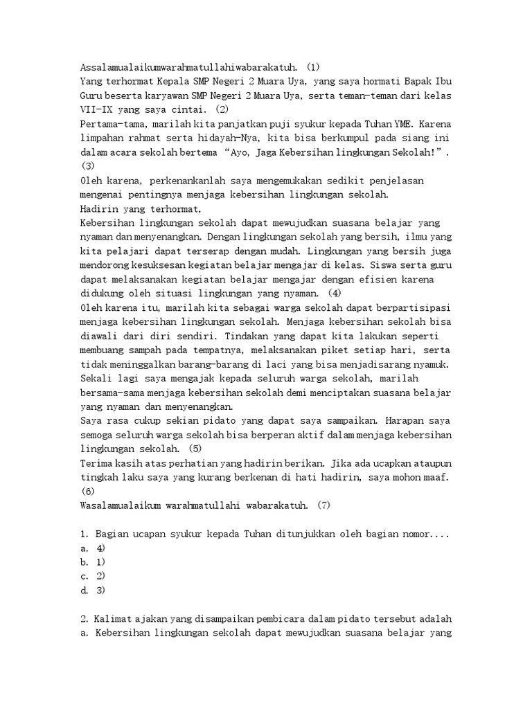 Kalimat pembuka pidato ditunjukkan oleh nomor….a. 1b. 2c. 3 …