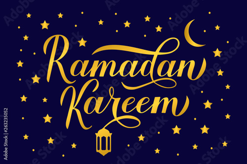 Ramadan Kareem gold calligraphy lettering on dark blue background. Muslim holy month typography poster. Islamic traditional vector illustration. Template for banner, greeting card, flyer, invitation. - Buy this stock vector and explore